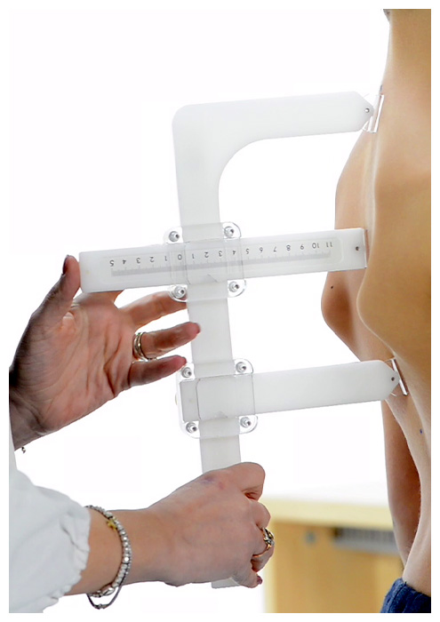 Per misurare il tratto di rachide sul piano sagittale (cifosi o lordosi) l’arcometro viene posizionato con le aste laterali all’estremità della curva. Tale valore rappresenta la corda. L’asta centrale viene portata nel punto medio di tale distanza e quindi viene accostata al dorso; la sua scala millimetrata ci fornisce il valore della freccia.